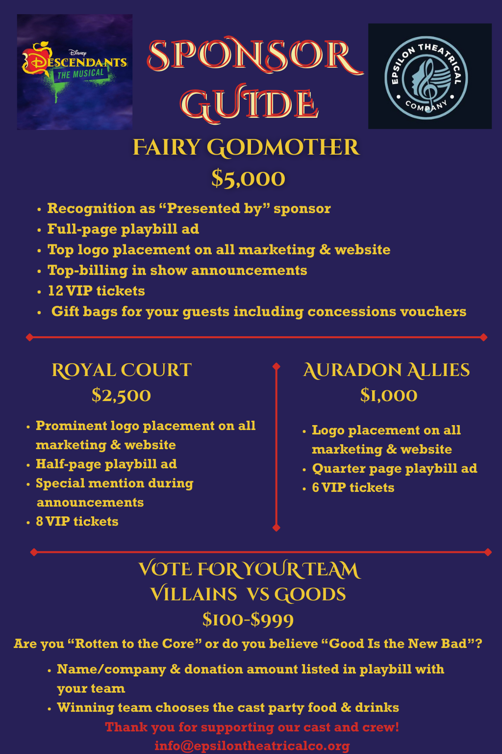 - Auradon Allies — $1,000 (logo + playbill presence + VIP tickets)